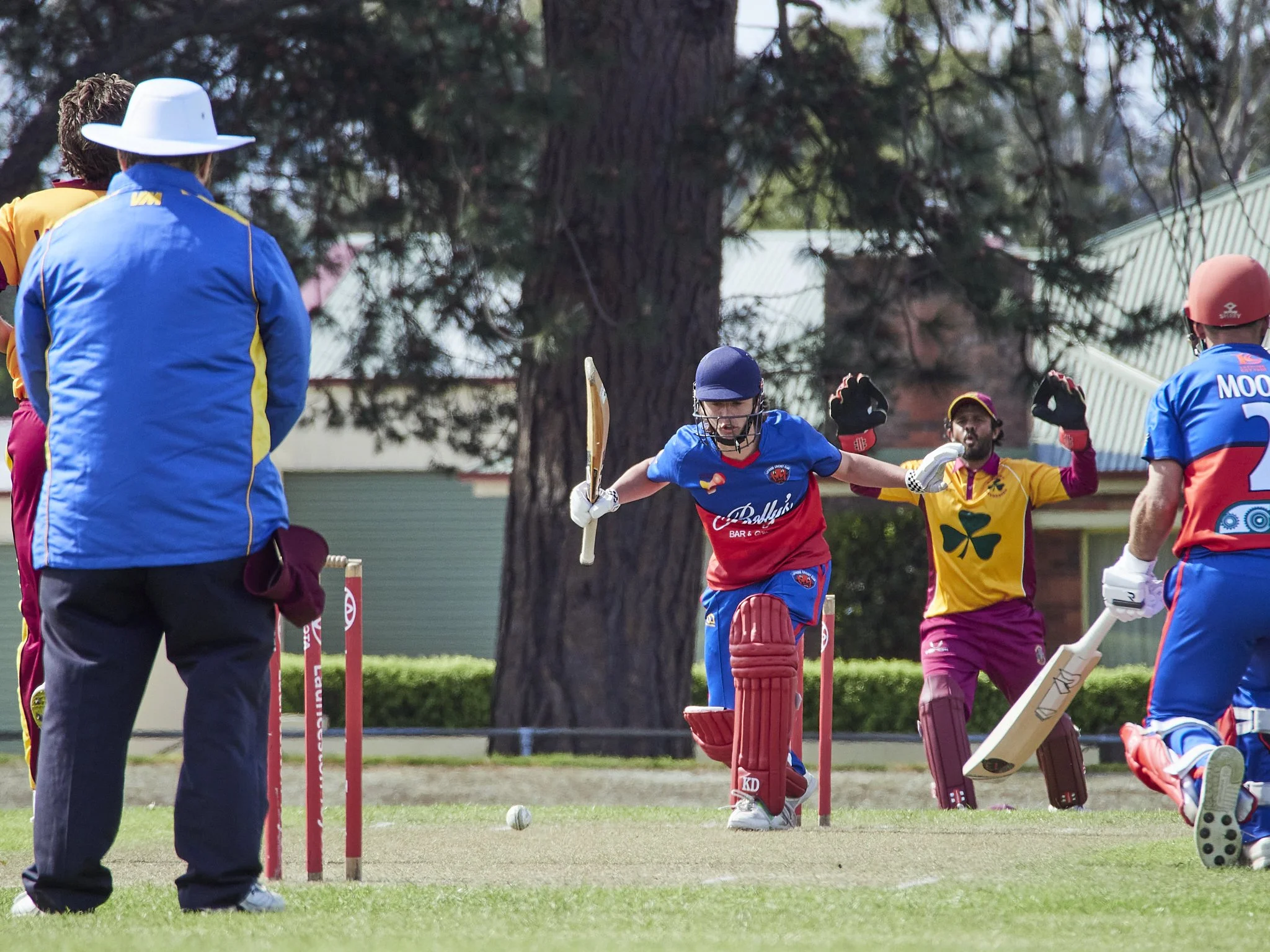 I love shooting end to end. It gives you the two principal players and potentially the keeper and umpire. When facing the batsman, you have to be small and still, often hiding in the background if possible, but the results can be worth it. When facing the bowler, there is no such limitation. The ball is missing in the one above, but the drama is intact.